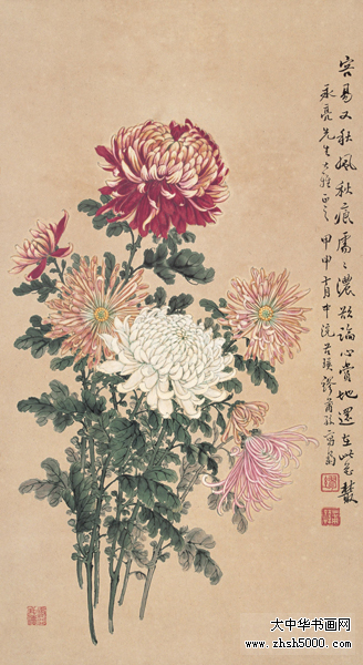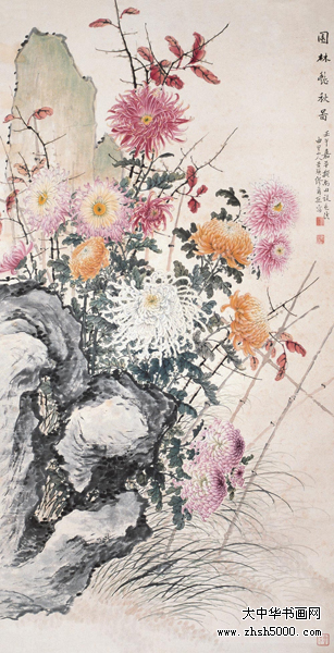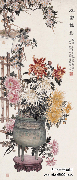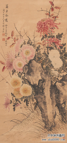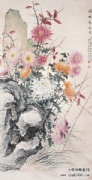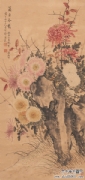 缪谷瑛 (1875~1954),字莆孙,号由里山人、晚香室主。江苏江阴人。为黄山寿再传弟子。工画花卉,最擅写菊。寄居上海,曾任教于仓圣明智大学,为国画教师。时哈同爱俪园中名菊甚众,其课余必往写生。工笔彩绘,极得秋色晚香之盛。经历年积累,笔下所绘之菊达三百余种,时人称之为“画菊专家”。工诗,有《晚香室诗钞》稿。1925年与吴昌硕、王震、张大千、刘海粟等活动于海上书画联合会,1934年又参与婆罗画社活动。其传世作品有1930年作《香清三径图》轴(图录于《现代书画集》)。1950年作《晚香图》长卷,其中名菊有三十二种之多,历时十余寒暑始成。1924年中华书局出版《由里山人菊谱》两册。1936年由于战乱续集画稿不幸遗失,未能出版。1947年《中国美术年鉴》载有《晚香室同门录》。